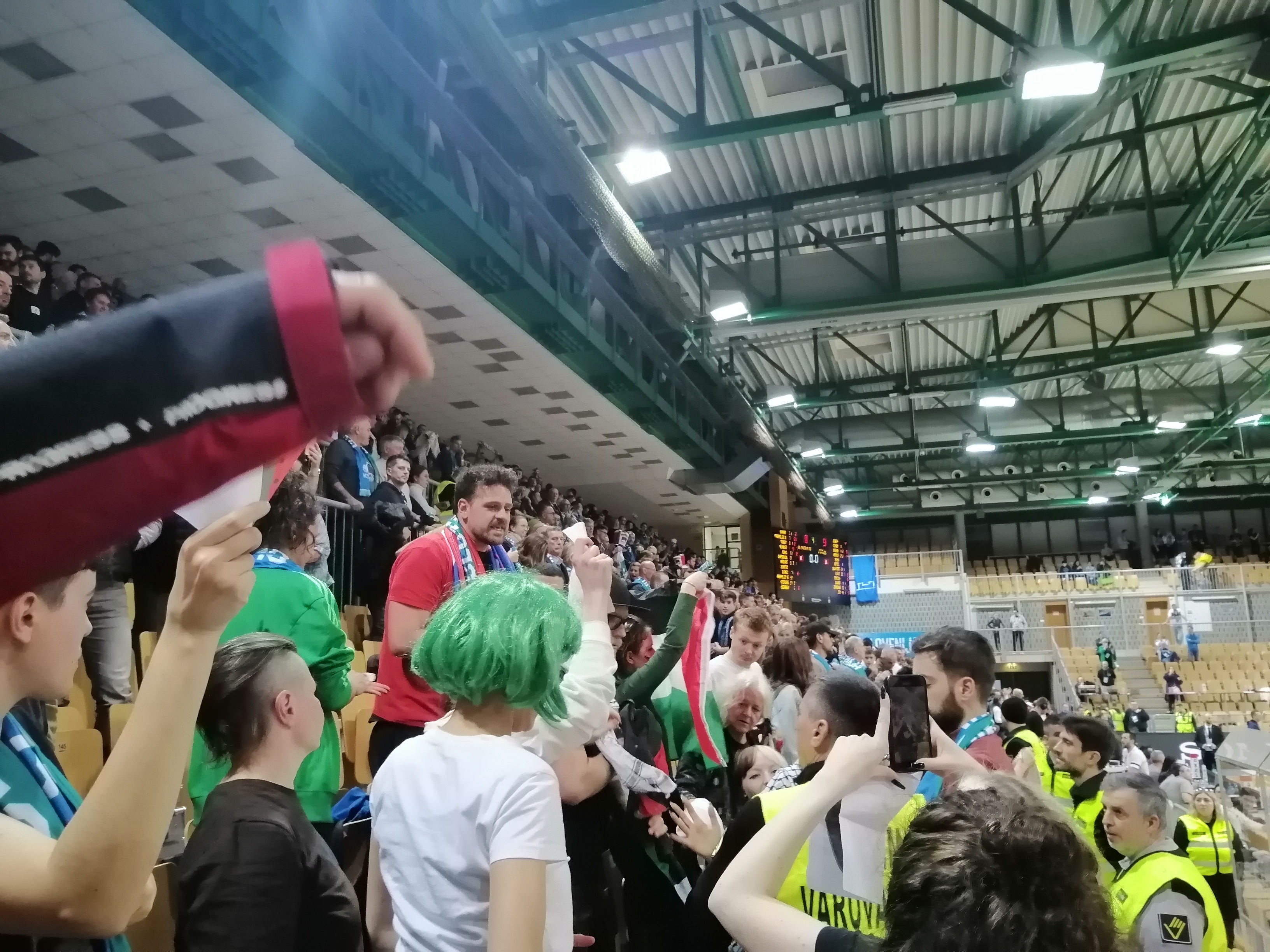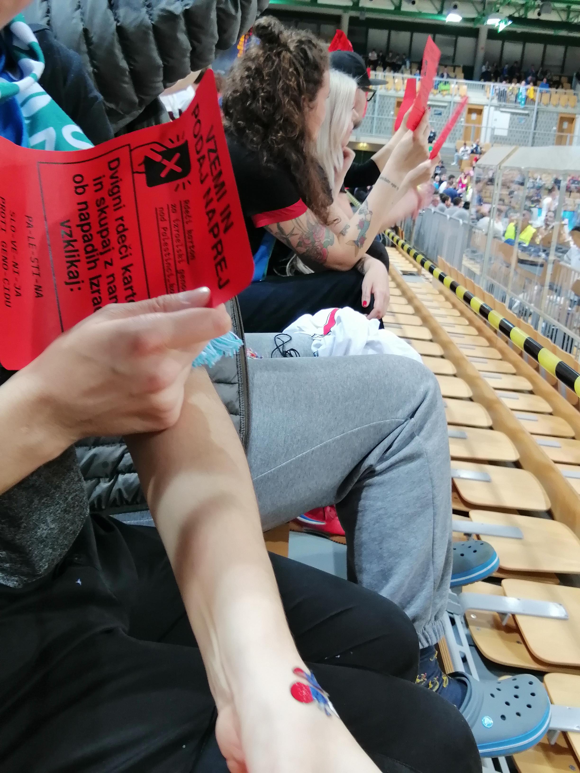 V dvorani je večina protestnikov zasedla tribuno za klopjo izraelske reprezentance. Z vzkliki so se skušali dopolnjevati s siceršnjim navijanjem: