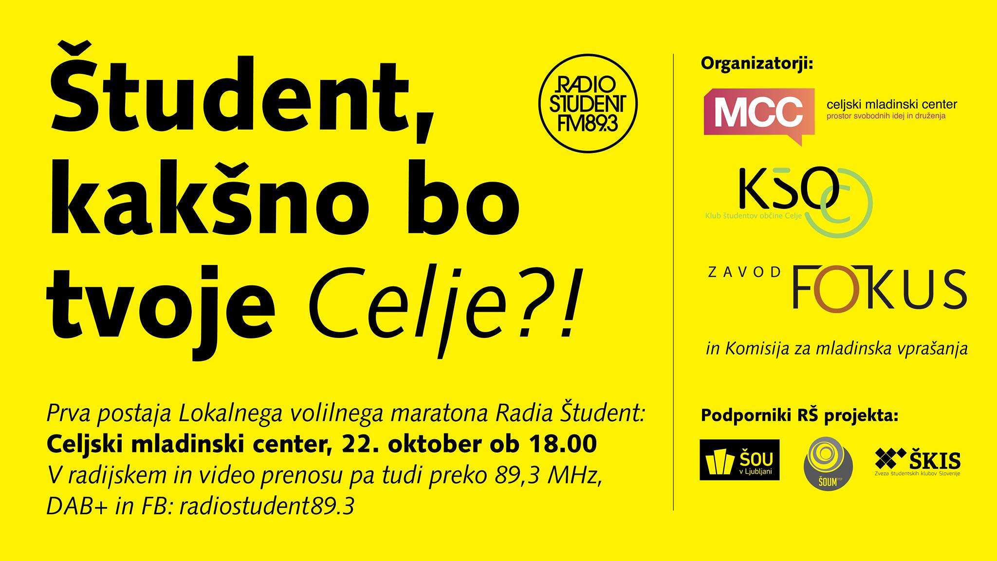 Prvi postanek Lokalnega volilnega maratona Radia Študent (LMV RŠ) bo v Celju, in sicer na dogodku Dialog mladih z županskimi kandidati, ki ga soorganiziramo Mcc Celjski Mladinski Center, Zavod FOKUS, Klub študentov občine Celje, Komisija za mladinska vprašanja in Radio Študent.
