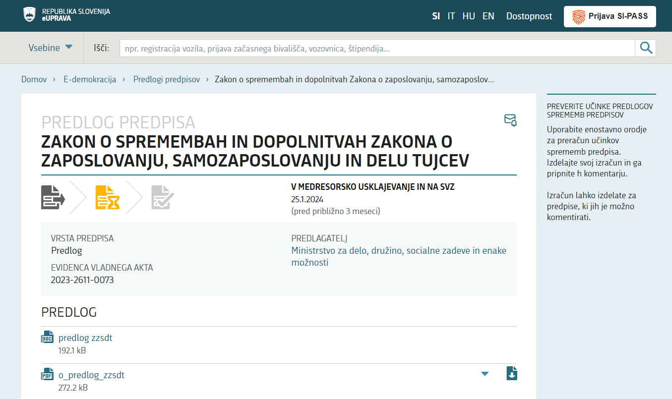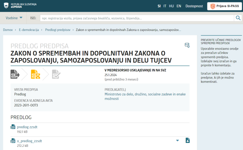 V medresorskem usklajevanju je nov predlog Zakona o spremembah in dopolnitvah Zakona o tujcih, ki ga je pripravilo notranje ministrstvo. Hkrati je v medresorskem usklajevanju tudi predlog Zakona o spremembah in dopolnitvah Zakona o zaposlovanju, samozaposlovanju in delu tujcev, ki ga je pripravilo ministrstvo za delo. Predloga zakonov sta bila vložena istočasno, saj gre pri obeh za prenos evropskih direktiv, ki spreminjajo pogoje za pridobitev in ohranitev modre karte Evropske unije, na nacionalno raven. Direktiva velja v državah članicah Evropske unije, razen na Danskem in v Republiki Irski.Zakon o tujcih med kategorije tujcev, ki lahko družinske člane združujejo brez omejitev glede trajanja tujčevega bivanja v Sloveniji in veljavnosti njegovega dovoljenja, dodaja tujce, ki imajo dovoljenje za začasno prebivanje kot digitalni nomadi. Dodaja tudi tujce, ki so slovenskega rodu do drugega kolena v ravni vrsti, ter tujce, ki so v Sloveniji neposredno pred pridobitvijo dovoljenja bivali na podlagi začasne zaščite kot razseljene osebe. Družinski člani tujcev bodo v Sloveniji lahko začeli bivati ob izdaji potrdila o vloženi prošnji in do dokončne odločitve o prošnji. Ministrstvo za notranje zadeve smo v času priprave oddaje prosili za pojasnila, a so nam sporočili, da jih ne morejo podati, ker je zakon v medresorskem usklajevanju.