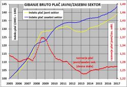 Podrobnejše podatke imamo torej samo za zaposlene pri pravnih osebah, pri tem pa statistika ločeno spremlja tudi podatke o teh plačah zasebnega (okoli 500 tisoč ljudi) in javnega sektorja (166 tisoč). Na spodnjem grafikonu je tako prikazano gibanje plač teh dveh skupin zaposlenih v obliki indeksa z začetno osnovo leta 1995. Pri tem je zaradi manjših nihanj upoštevano 12-mesečno povprečje plač. Poleg indeksa rasti, je na grafikonu z desno skalo in rdečo barvo še prikaz razmerja med povprečno bruto plačo v javnem in zasebnem sektorju.