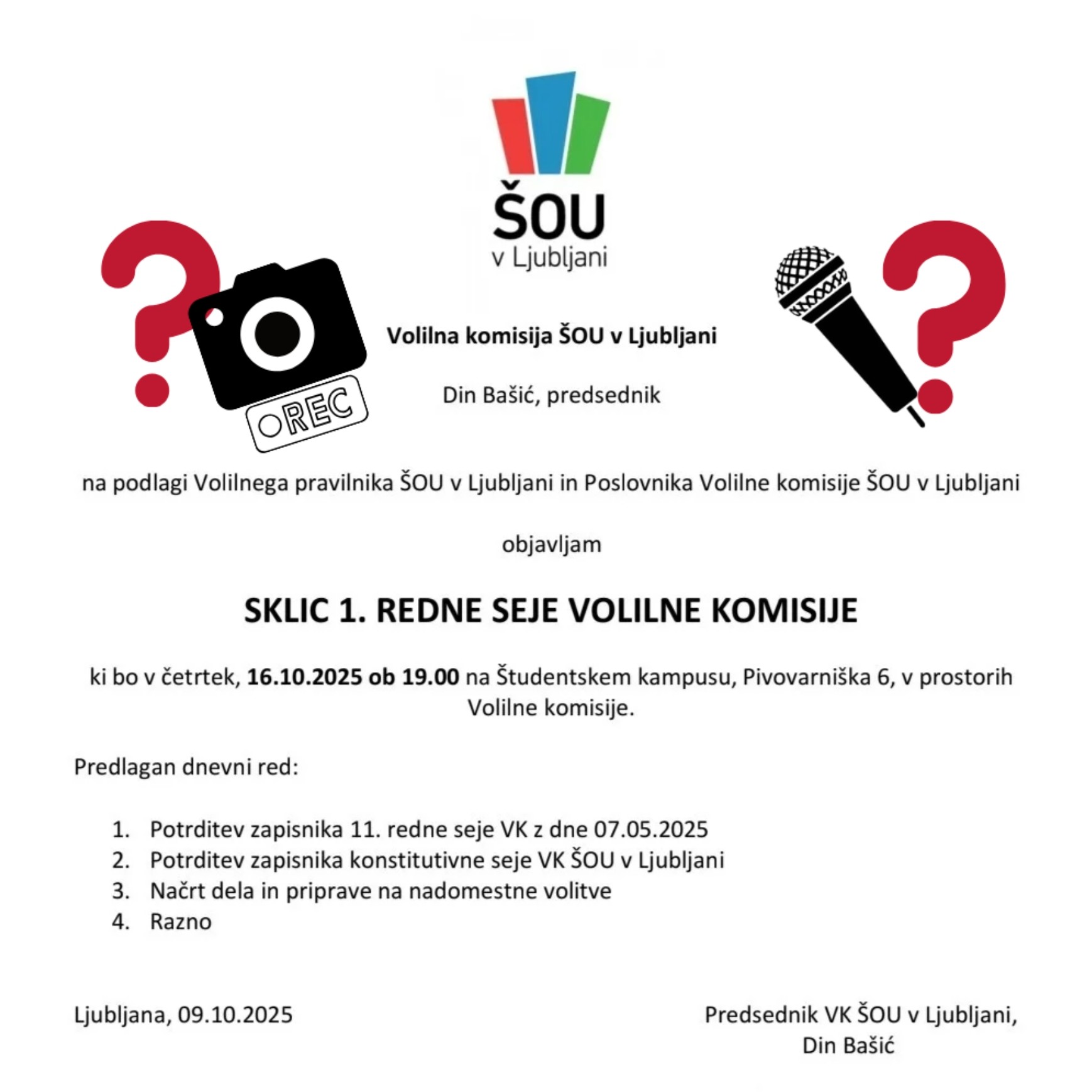 V četrtek, 16. oktobra, se je nekaj minut čez 19. uro na Študentskem kampusu odvila 1. redna seja volilne komisije Študentske organizacije Univerze v Ljubljani, krajše ŠOU. Na seji so bili prisotni predsednik volilne komisije, Din Bašić z Ekonomske fakultete, ter pet članov volilne komisije: Tina Gobec in Simon Trussevich s Pravne fakultete, doktorski študent Medicinske fakultete Gorazd Levičnik ter Mateja Firez in Petar Petkovski s Fakultete za družbene vede. Opravičeno odsoten je bil poslanec Lovro Jovič, ki je prav tako študent FDV-ja.