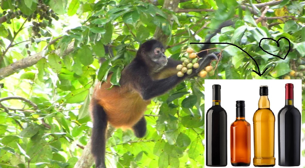 Sadje, ki ga uživajo omenjene opice, se imenuje jamajška sliva ali Spondias mombin. Avtohtoni prebivalci Srednje in Južne Amerike uporabljajo te sadeže za izdelavo čiče, fermentirane alkoholne pijače. Prisotnost alkohola v sadju je produkt naravne fermentacije kvasovk, ki porabljajo sladkor v zrelem sadju. Višja vsebnost sladkorja v sadju pomeni več hrane za kvasovke in posledično večji delež nastalega alkohola. Iz fermentiranega sadja tako opice pridobijo več kalorij, to pa je z evolucijskega vidika seveda zaželeno, saj več kalorij pomeni več energije.